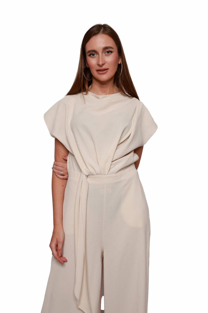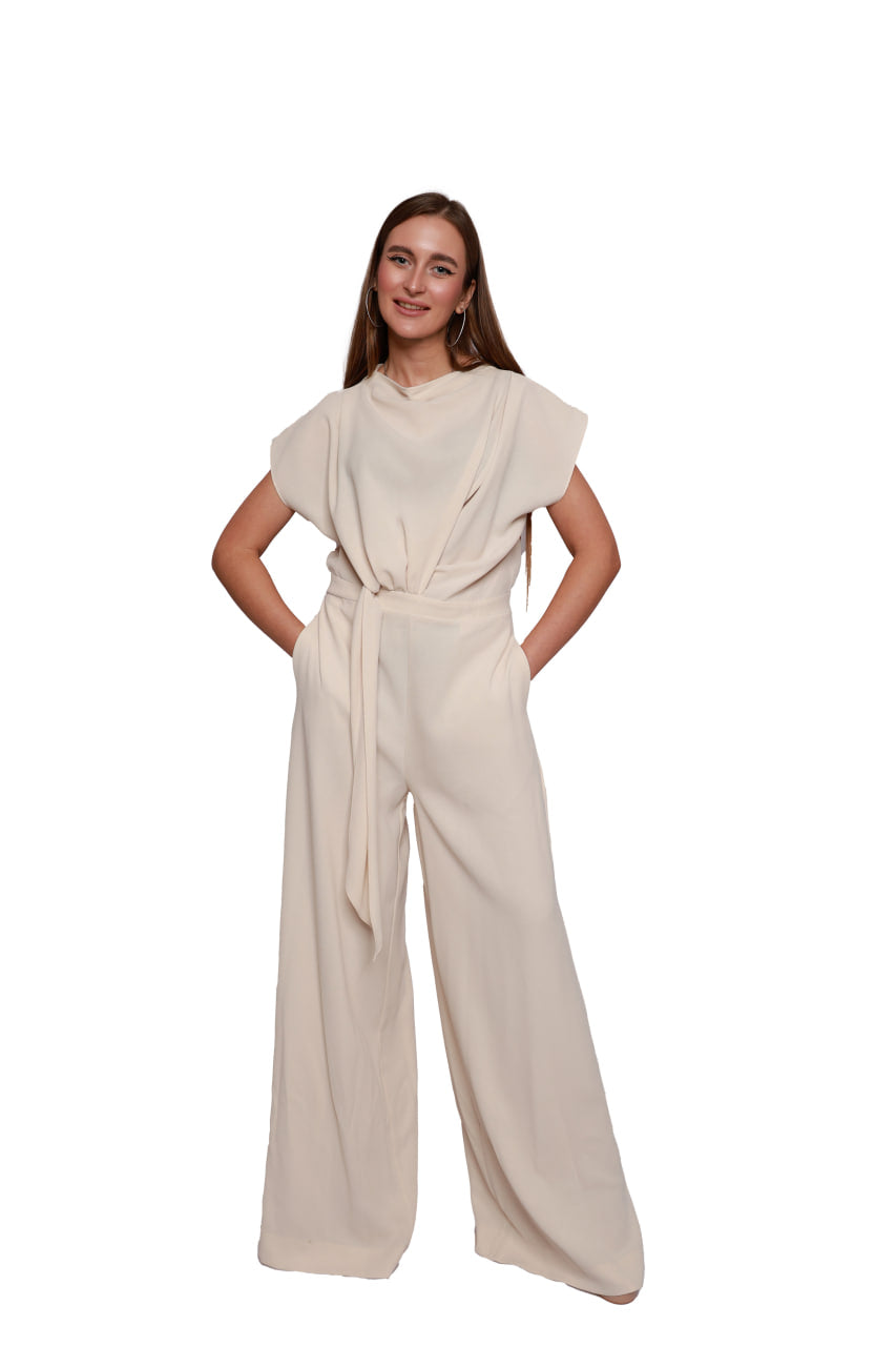 Elevate your wardrobe with our effortlessly stylish Off White Wide-Leg Jumpsuit – a perfect blend of sophistication and comfort. Designed with a relaxed yet flattering silhouette, this jumpsuit features a soft draped neckline, flowy wide-leg pants, and a matching fabric belt that cinches the waist for a refined look.